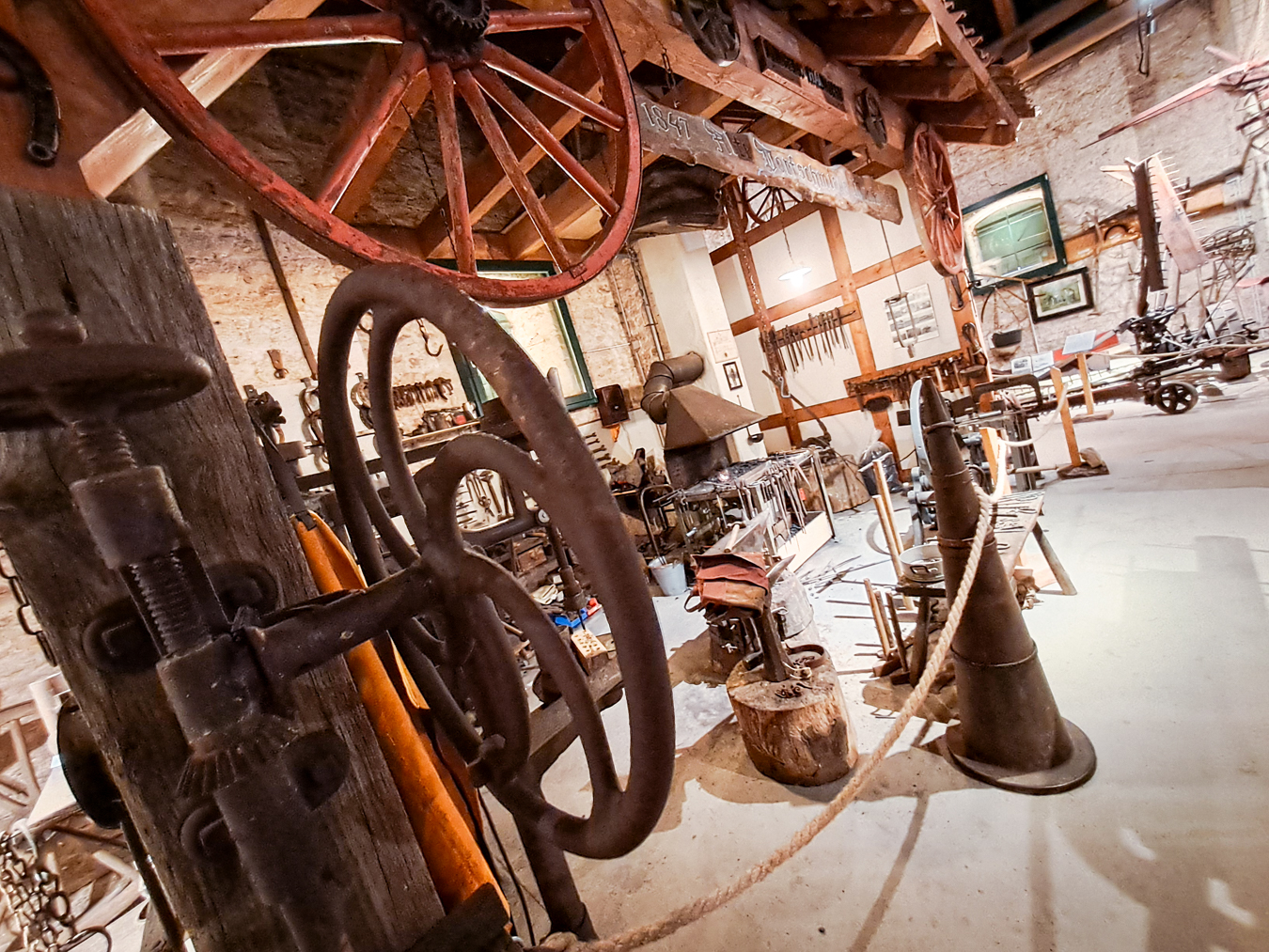 Außerdem findet ihr eine alte Schulbank nebst Tafel und Griffel sowie die originale und funktionsfähige Waaker Dorfschmiede, in der an manchen Tagen sogar live geschmiedet wird. Auch eine historische Bauernküche mit Schlafplatz und Webstuhl, ein Plumps-Klo und eine Sammlung von Kutschen sowie von historischen Waschmaschinen sind zu entdecken. Das Ganze nach einer aufwendigen Sanierung der Scheune eindrucksvoll präsentiert …